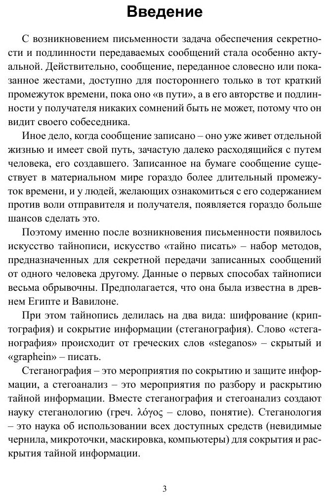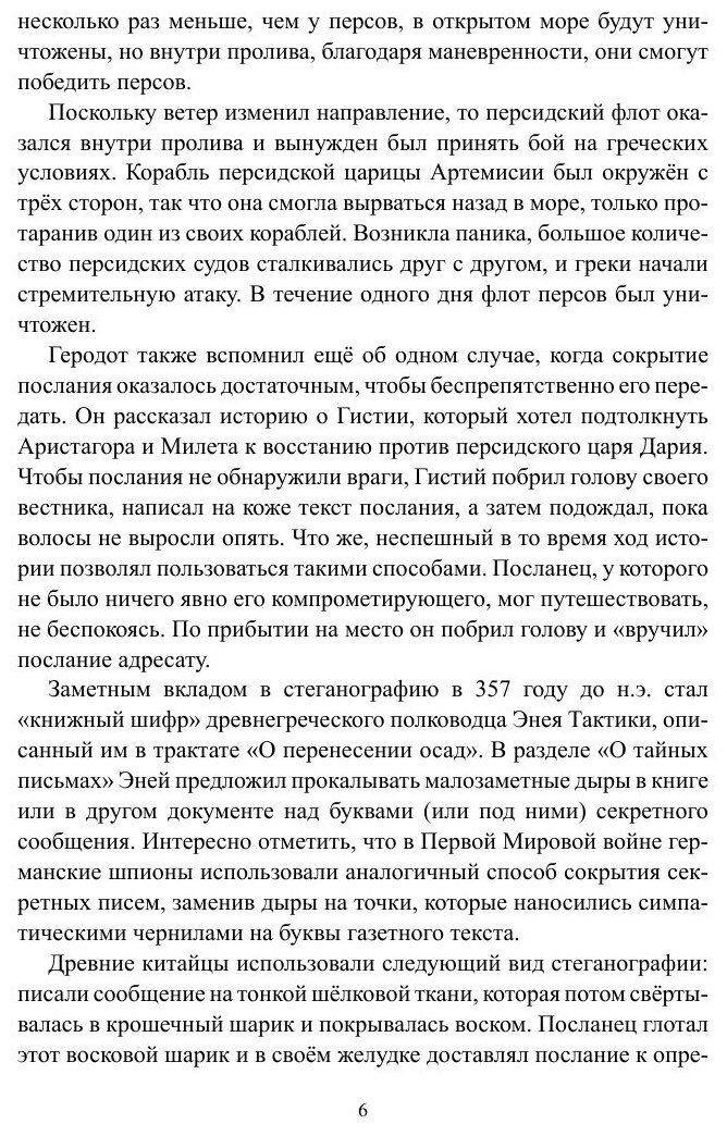 В отличие от криптографии, которая шифрует содержимое секретного сообщения, стеганография скрывает сам факт его существования. При этом ее можно совмещать с методами криптологии, усложняя в целом систему защиты информации.Книга рассказывает историю рождения и эволюции стеганографии в мире, разработки и усложнения методов и средств скрытой тайнописи: невидимые чернила, маскировка и микроточки, а также описывает современные цифровые стеганографические технологии и кибератаки.