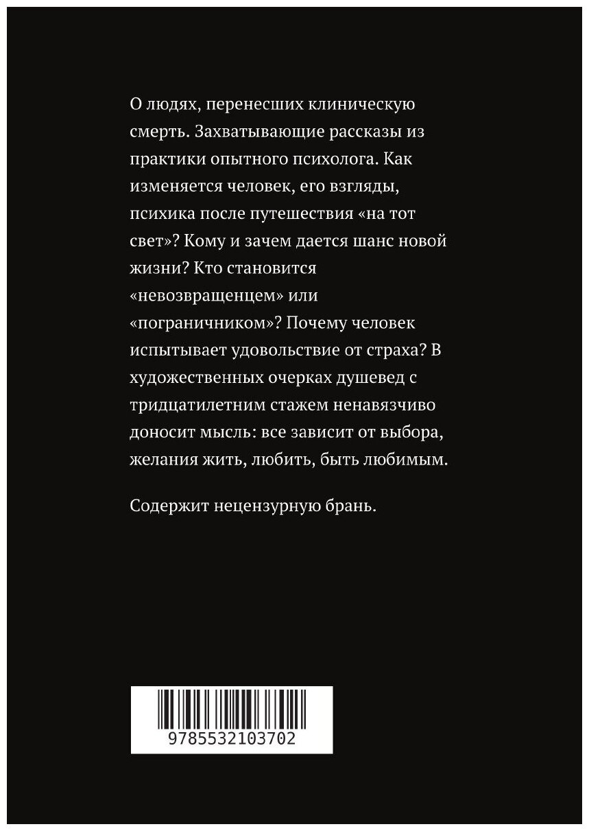О людях, перенесших клиническую смерть. Захватывающие рассказы из практики опытного психолога. Как изменяется человек, его взгляды, психика после путешествия «на тот свет»? Кому и зачем дается шанс новой жизни? Кто становится «невозвращенцем» или «пограничником»? Почему человек испытывает удовольствие от страха? В художественных очерках душевед с тридцатилетним стажем ненавязчиво доносит мысль: все зависит от выбора, желания жить, любить, быть любимым.Содержит нецензурную брань.