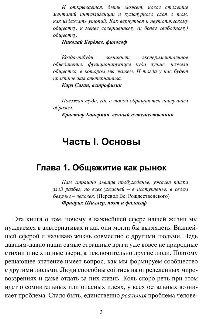 Читателю предлагаются прямые вопросы и размышление о том, действительно ли нам хочется продолжать жить в нынешних политических системах, где у нас нет настоящей свободы действия, или же стоит создать что-то новое и более эффективное : самостоятельные города-государства, аналог свободных экономических зон со своими законами «динамичного капитализма», без политики в сегодняшнем виде, в чём люди принимали бы участие лишь тогда, когда сами захотят.