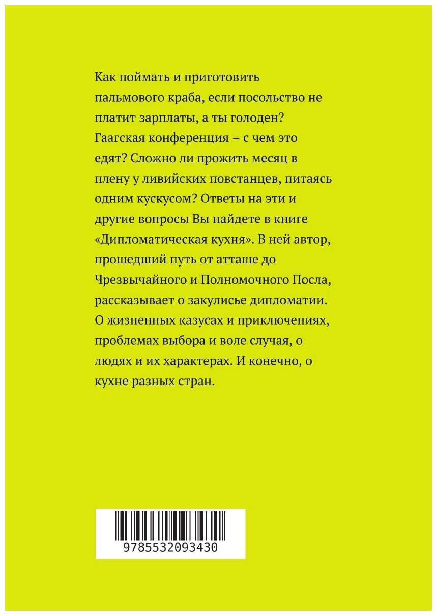 Как поймать и приготовить пальмового краба, если посольство не платит зарплаты, а ты голоден?Гаагская конференция – с чем это едят?Сложно ли прожить месяц в плену у ливийских повстанцев, питаясь одним кускусом?Ответы на эти и другие вопросы Вы найдете в книге «Дипломатическая кухня». В ней автор, прошедший путь от атташе до Чрезвычайного и Полномочного Посла, рассказывает о закулисье дипломатии. О жизненных казусах и приключениях, проблемах выбора и воле случая, о людях и их характерах. И конечно, о кухне разных стран.