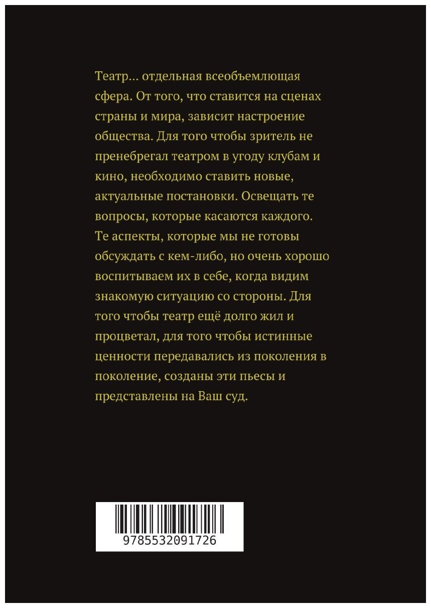 Театр… отдельная всеобъемлющая сфера. От того, что ставится на сценах страны и мира, зависит настроение общества. Для того чтобы зритель не пренебрегал театром в угоду клубам и кино, необходимо ставить новые, актуальные постановки. Освещать те вопросы, которые касаются каждого. Те аспекты, которые мы не готовы обсуждать с кем-либо, но очень хорошо воспитываем их в себе, когда видим знакомую ситуацию со стороны. Для того чтобы театр ещё долго жил и процветал, для того чтобы истинные ценности передавались из поколения в поколение, созданы эти пьесы и представлены на Ваш суд.