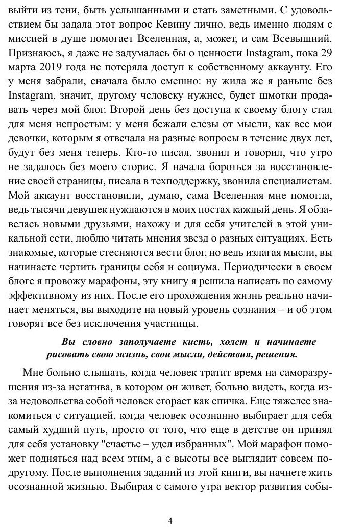Книга "Окрыляющий марафон" адресована осознанным читателям, которые давно планировали увлекательное путешествие в свой внутренний мир. Человечество живет в эпоху перехода Земли на новый энергетический уровень. Люди просыпаются, уходят от "рамочного" мышления, хотят двигаться вперёд и вести за собой других. Прочитав книгу, вы узнаете секретный принцип "быть в потоке", ответите на вопрос, почему мы боимся исполнения собственных мечтаний, поработаете с энергией своего рода. Сила природы, сила внутренней опоры – все эти темы раскрыты и проиллюстрированы историями реальных людей.