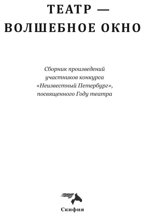 В сборник «Театр – волшебное окно» вошли произведения победителей и участников популярного литературного конкурса «Неизвестный Петербург», посвященного Году театра на берегах Невы. Среди его авторов – не только известные петербургские писатели Татьяна Алферова, Владимир Шпаков, Галина Илюхина, Елена Елагина, Татьяна Кудрявцева, Мария Амфилохиева, Валентина Ефимовская, Владимир Симаков, Николай Прокудин, Александр Медведев, Татьяна Лестева, Геннадий Муриков, Игорь Мощицкий, но и обычные горожане – учителя, краеведы, пенсионеры, студенты, школьники. Каждый из них постарался рассказать о любимых петербургских театрах, спектаклях, режиссерах и актерах.