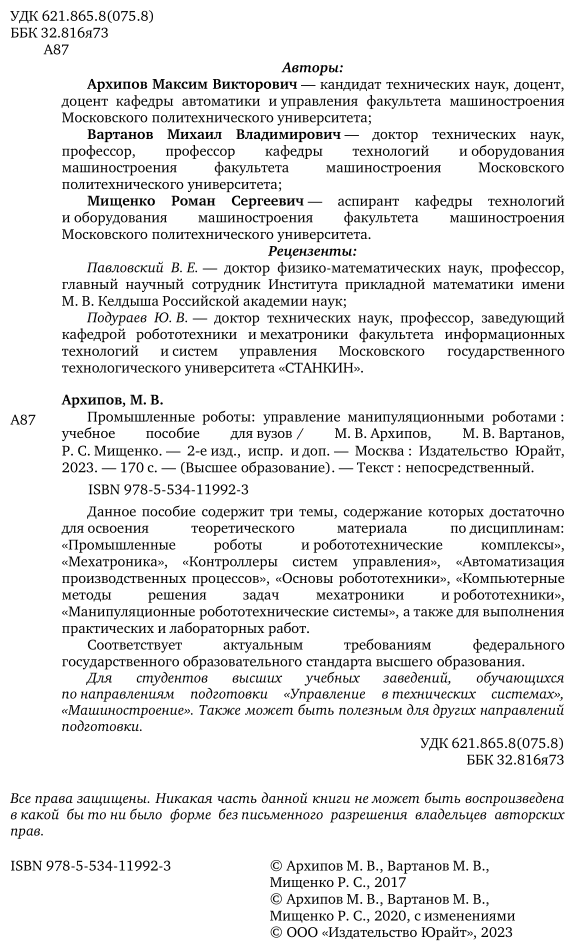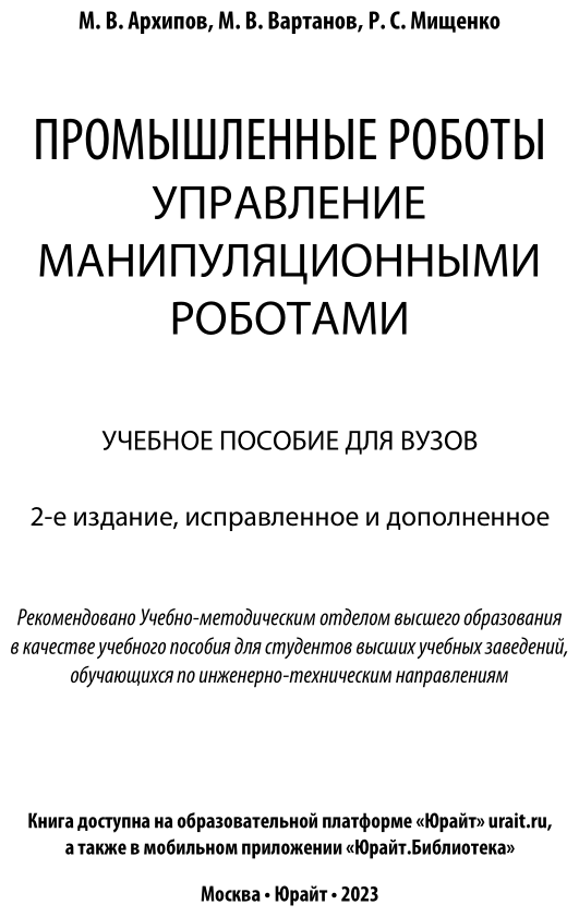 Промышленные роботы: управление манипуляционными роботами 2-е изд. испр. и доп. Учебное пособие для вузов (Архипов Максим Викторович; Вартанов Михаил Владимирович; Мищенко Роман Сергеевич); ЮРАЙТ, 2022