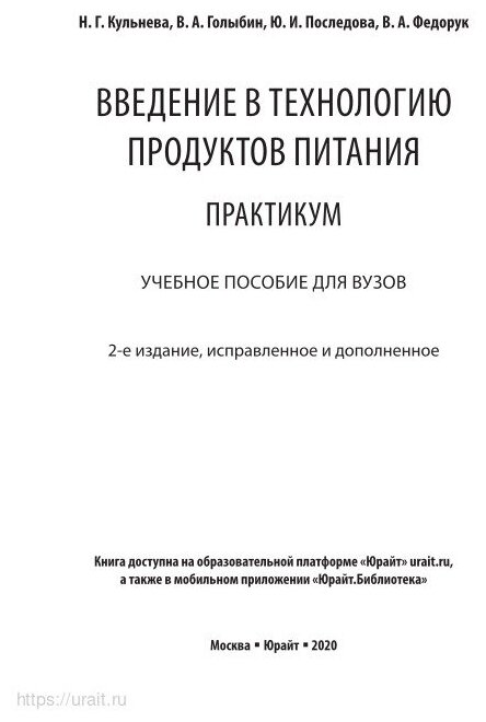 Введение в технологию продуктов питания. Практикум 2-е изд. испр. и доп. Учебное пособие для вузов (Кульнева Надежда Григорьевна; Голыбин Вячеслав Алексеевич; Последова Юлия Ивановна; Федорук Владимир Алексеевич); ЮРАЙТ, 2022