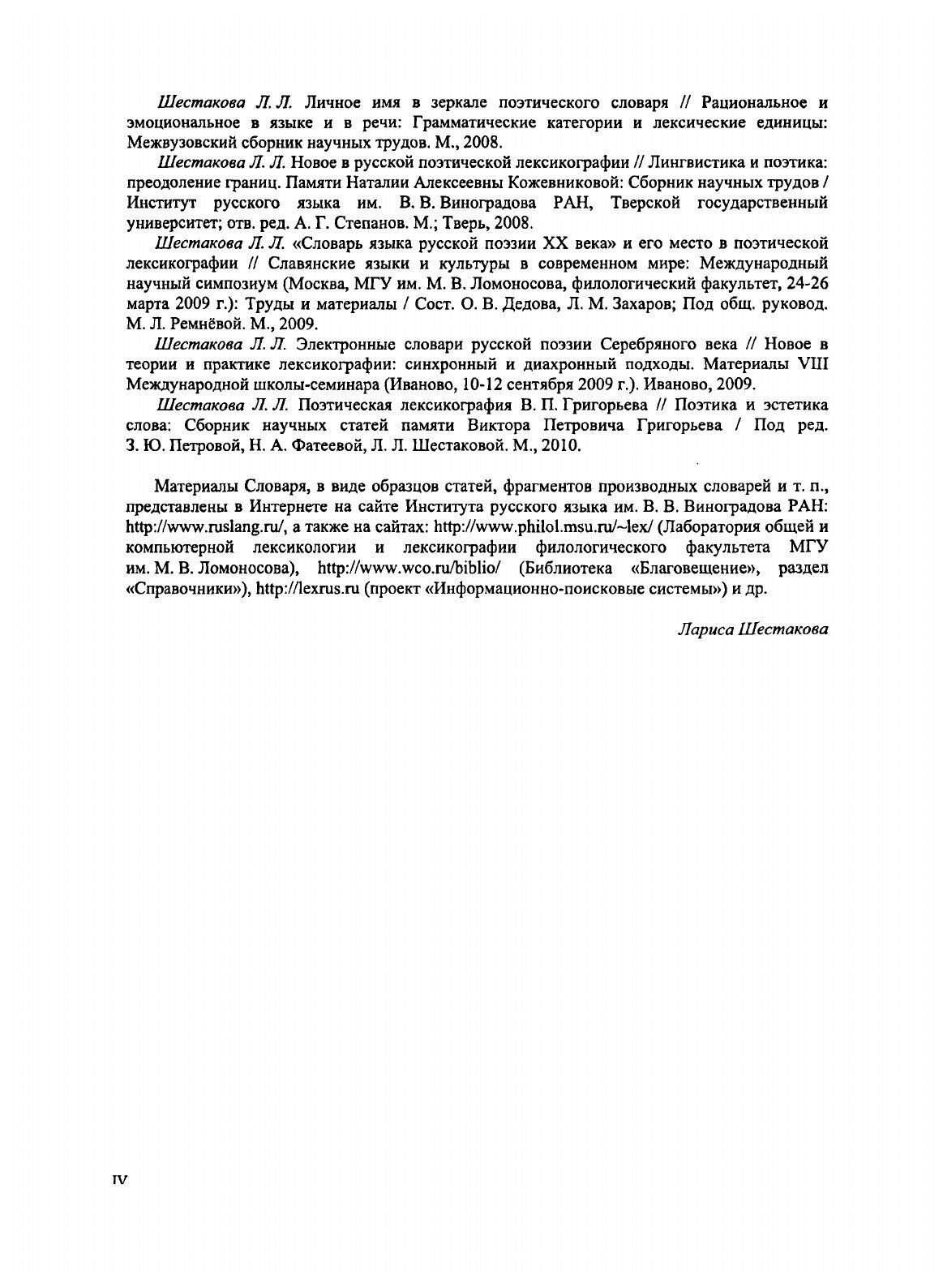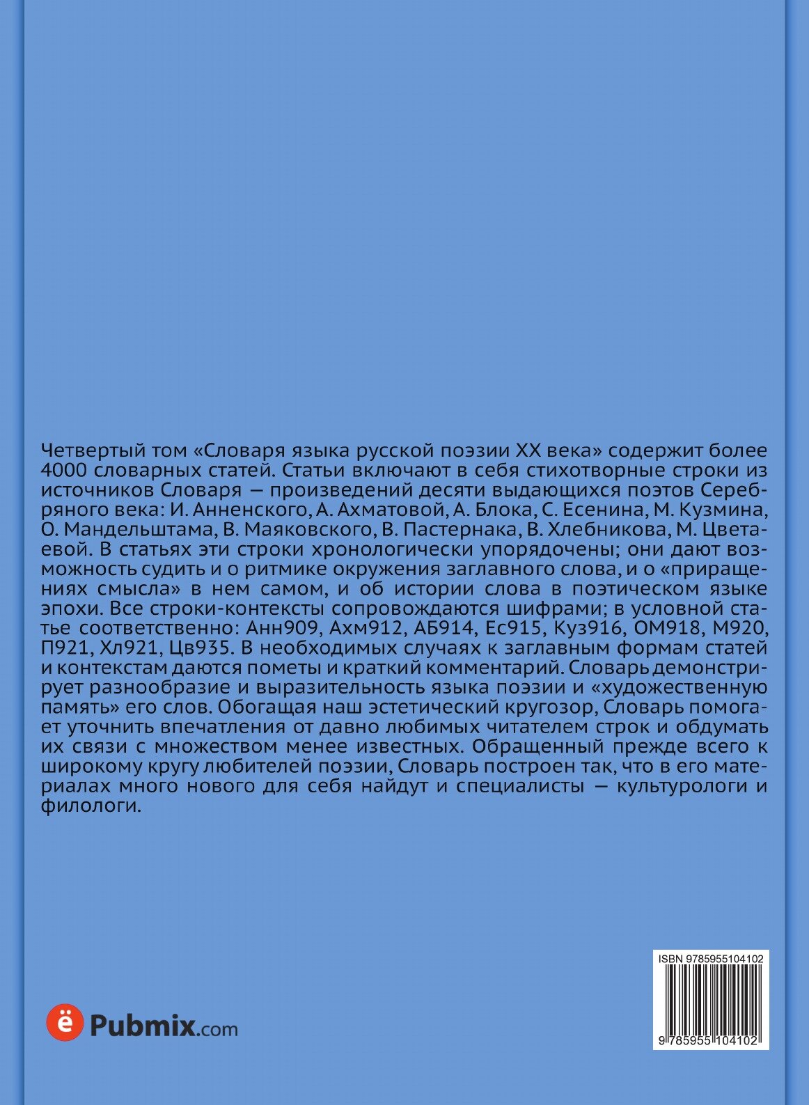Четвертый том «Словаря языка русской поэзии XX века» содержит более 4000 словарных статей. Статьи включают в себя стихотворные строки из источников Словаря – произведений десяти выдающихся поэтов Серебряного века: И. Анненского, А. Ахматовой, А. Блока, С. Есенина, М. Кузмина, О. Мандельштама, В. Маяковского, Б. Пастернака, В. Хлебникова, М. Цветаевой. В статьях эти строки хронологически упорядочены; они дают возможность судить и о ритмике окружения заглавного слова, и о «приращениях смысла» в нем самом, и об истории слова в поэтическом языке эпохи. Все строки-контексты сопровождаются шифрами; в условной статье соответственно: Анн90, Ахм912, АБ914, Ес915, Куз916, ОМ918, М920, П921, Хл921, Цв935. В необходимых случаях к заглавным формам статей и контекстам даются пометы и краткий комментарий. Словарь демонстрирует разнообразие и выразительность языка поэзии и «художественную память» его слов. Обогащая наш эстетический кругозор, Словарь помогает уточнить впечатления от давно любимых читателем строк и обдумать их связи с множеством менее известных. Обращенный прежде всего к широкому кругу любителей поэзии, Словарь построен так, что в его материалах много нового для себя найдут и специалисты – культурологи и филологи.