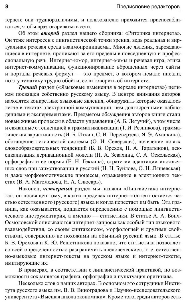 Исследуя современную языковую ситуацию, необходимо учитывать речевую практику носителей языка, связанную с коммуникацией в интернет-пространстве. В этой книге собраны статьи специалистов, анализирующих интернет-тексты как новый языковой ресурс. Рассматриваются особенности структуры текста, лексика и синтаксис поискового запроса, коммуникативная направленность интернет-высказывания и влияние этого нового речевого пласта на современный русский язык. Одновременно анализируются изменения, которые касаются самого русского языка: возникающие грамматические формы, сдвиги в глагольном управлении, лексические неологизмы. Для них интернет выступает «камерой», быстро и точно отражающей мельчайшие новации. Книга адресована всем интересующимся русским языком, в том числе и профессионалам: преподавателям и лингвистам – грамматистам и лексикографам. Она будет полезна и разработчикам контента интернет-сайтов или редакторам порталов для профилактики нарушений цельности, связности, завершенности текста, и пользователям для решения задач по оптимизации поисковых запросов.