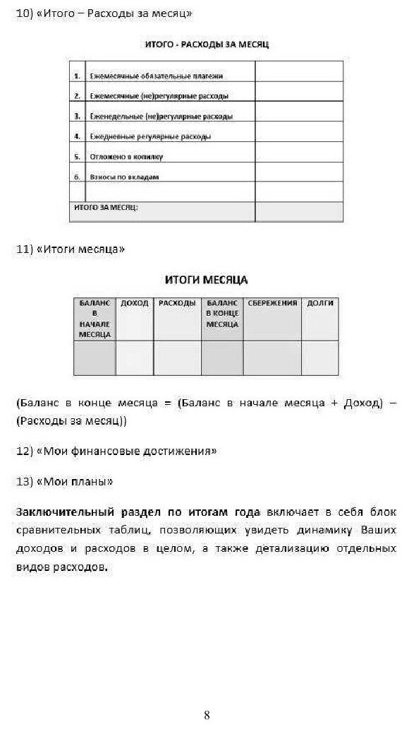 Блокнот позволяет фиксировать доходы, расходы, сбережения, долги, баланс в начале и в конце месяца. Структура блокнота отражает статьи расходов и доходов, а также частоту определенных видов расходов, что позволит анализировать информацию и корректировать свое финансовое поведение. Основная особенность – это типизация расходов. Выделены ежемесячные обязательные платежи, (не)регулярные ежемесячные расходы, (не)регулярные еженедельные расходы, ежедневные регулярные расходы. Есть сводные таблицы, где можно наблюдать динамику расходов детально по статьям расхода.