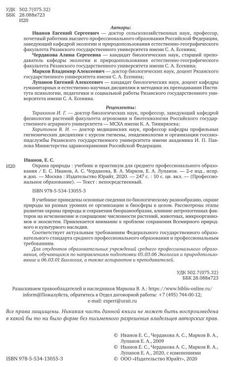 Охрана природы 2-е изд. испр. и доп. Учебник и практикум для СПО (Иванов Евгений Сергеевич; Чердакова Алина Сергеевна; Марков Владимир Алексеевич; Лупанов Евгений Алексеевич); ЮРАЙТ, 2022