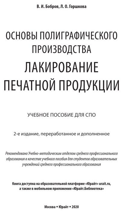 Основы полиграфического производства: лакирование печатной продукции 2-е изд. пер. и доп. Учебное пособие для СПО (Бобров Владимир Иванович; Горшкова Лариса Олеговна); Юрайт, 2019