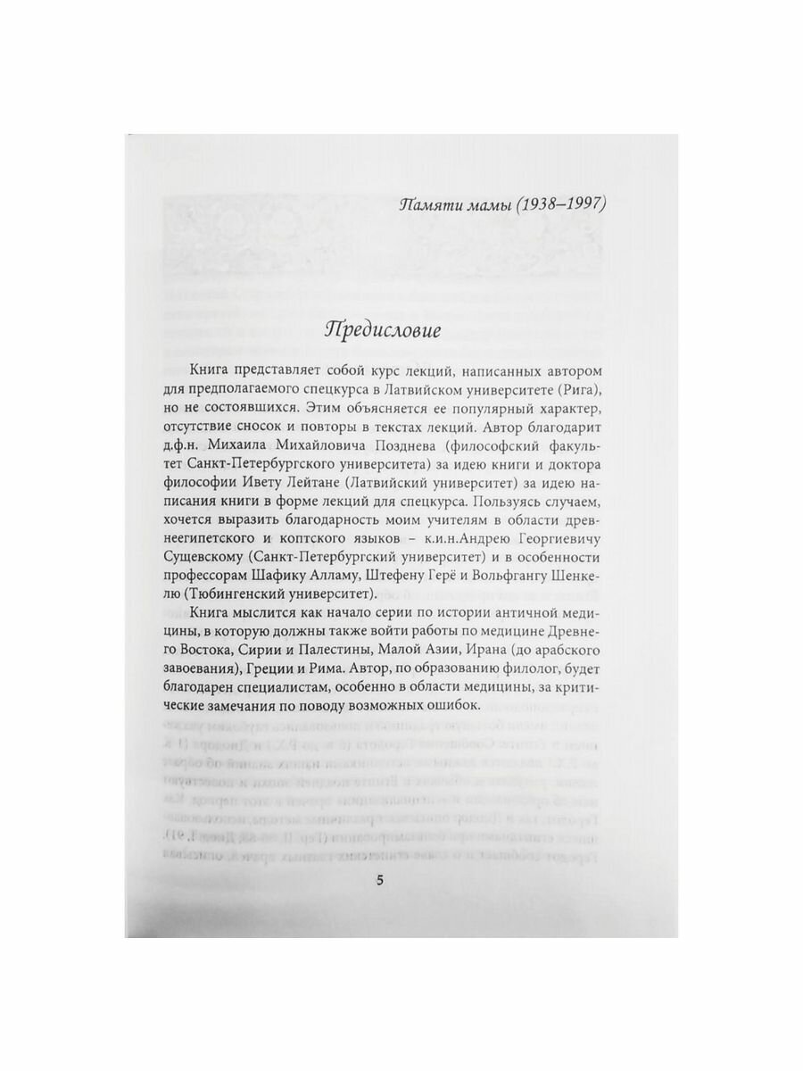 Книга представляет собой курс лекций, написанных автором для предполагаемого спецкурса в Латвийском университете (Рига), к сожалению, не состоявшихся. Книга мыслится как начало серии по истории античной медицины, в которую должны также войти работы по медицине Древнего Востока, Сирии и Палестины, Малой Азии, Ирана (до арабского завоевания), Греции и Рима. Автор, по образованию филолог, будет благодарен специалистам, особенно в области медицины, за критические замечания по поводу возможных ошибок.