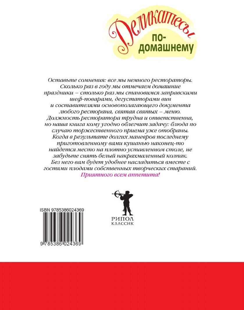Оставьте сомнения: все мы немного рестораторы. Сколько раз в году мы отмечаем домашние праздники – столько раз мы становимся заправскими шеф-поварами, дегустаторами вин и составителями основополагающего документа любого ресторана, святая святых – меню. Должность ресторатора трудна и ответственна, но наша книга кому угодно облегчит задачу: блюда по случаю торжественного приема уже отобраны. Когда в результате долгих маневров последнему приготовленному вами кушанью наконец-то найдется место на плотно уставленном столе, не забудьте снять белый накрахмаленный колпак. Без него вам будет удобнее насладиться вместе с гостями плодами собственных творческих стараний. Приятного всем аппетита!