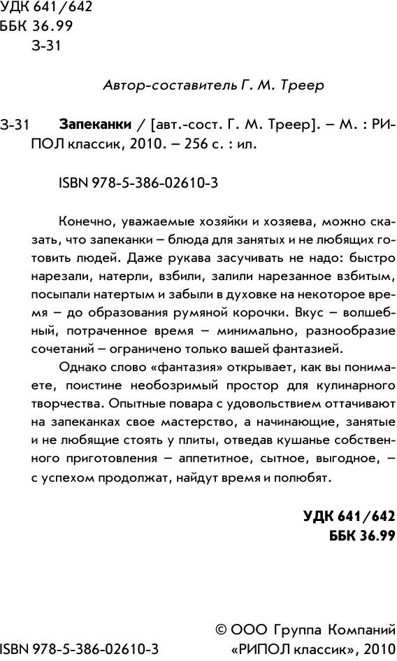 Отличная книжечка. Запеканки – это вообще любимая тема. Годятся на завтрак, обед, ужин и на десерт. Тупо следовать рецептам не для меня. Подобные книжечки я ценю прежде всего за то, что в них можно найти новые интересные идеи. И это издание порадовало. Особенно в смысле готовки из овощей и фруктов. Рекомендую всем хозяюшкам.