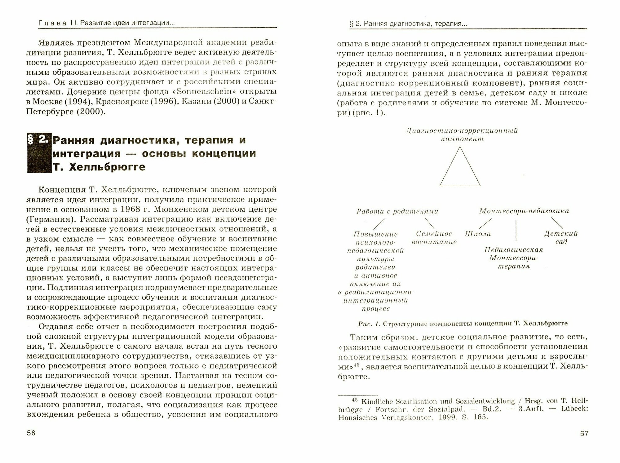 Книга посвящена актуальной проблеме коррекционной педагогики – интеграции детей с ограниченными возможностями в общество здоровых детей. Прослеживаются пути развития идеи интегрированного обучения и воспитания в историческом масштабе: представлены как отечественные, так и зарубежные разработки в сфере реабилитации развития и интеграции. В основной части показаны виды, методы, способы организации подобной работы на примере Мюнхенского детского центра (Германия), где впервые на практике была осуществлена идея совместного обучения и воспитания детей с различными образовательными возможностями. В этой концепции, автором которой является выдающийся немецкий педиатр и педагог Т. Хелльбрюгге, большое внимание уделяется работе с родителями. В качестве педагогической базы выступает педагогика М. Монтессори. Книга адресована специалистам, работающим в области коррекционной и интеграционной педагогики, и всем заинтересованным лицам, в том числе родителям.