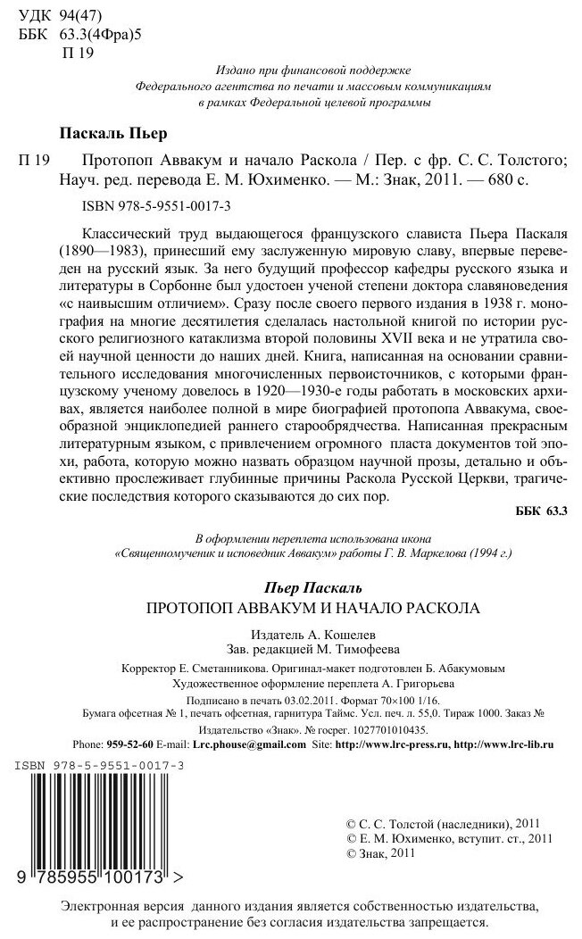 "Житие" протопопа Аввакума В. Пикуль называл «фундаментом русской литературы» и утверждал, что не зная Аввакума нельзя знать и русскую литературу. Очень жаль что сами рукописи не дошли до нас – только списки-копии. Книга, написанная на документальном материале французским ученым и опубликованная в Париже в 1938 году! Книга о расколе русской церкви, о религиозных проблемах семнадцатого века. Книга о человеке великой воли, непоколебимой веры. Книга будет интересна тем, кто интересуется историей русской церкви, да и России вообще. Спасибо Пьеру Паскалю за его труд!
