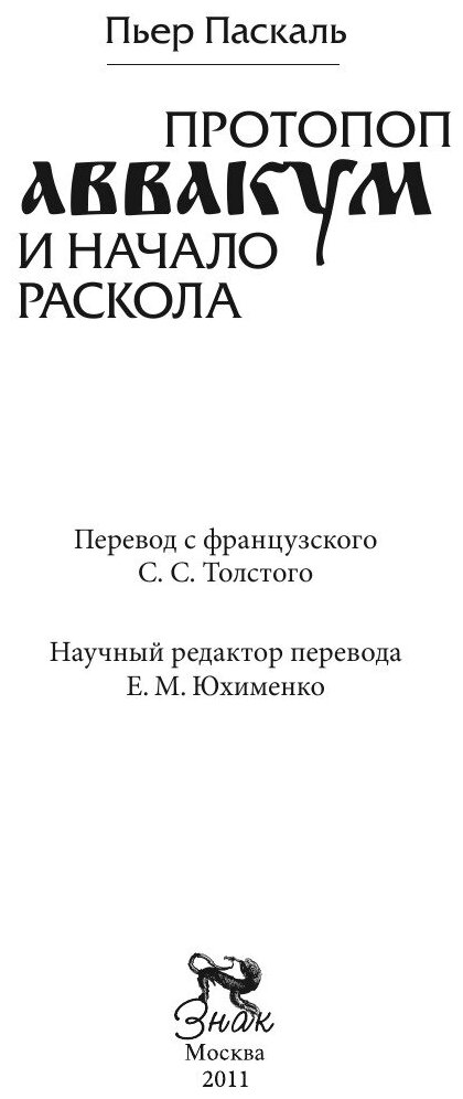 Классический труд выдающегося французского слависта Пьера Паскаля (1890—1983), принесший ему заслуженную мировую славу, впервые переведен на русский язык. За него будущий профессор кафедры русского языка и литературы в Сорбонне был удостоен ученой степени доктора славяноведения «с наивысшим отличием». Сразу после своего первого издания в 1938 г. монография на многие десятилетия сделалась настольной книгой по истории русского религиозного катаклизма второй половины XVII века и не утратила своей научной ценности до наших дней. Книга, написанная на основании сравнительного исследования многочисленных первоисточников, с которыми французскому ученому довелось в 1920—1930-е годы работать в московских архивах, является наиболее полной в мире биографией протопопа Аввакума, своеобразной энциклопедией раннего старообрядчества. Написанная прекрасным литературным языком, с привлечением огромного пласта документов той эпохи, работа, которую можно назвать образцом научной прозы, детально и объективно прослеживает глубинные причины Раскола Русской Церкви, трагические последствия которого сказываются до сих пор.