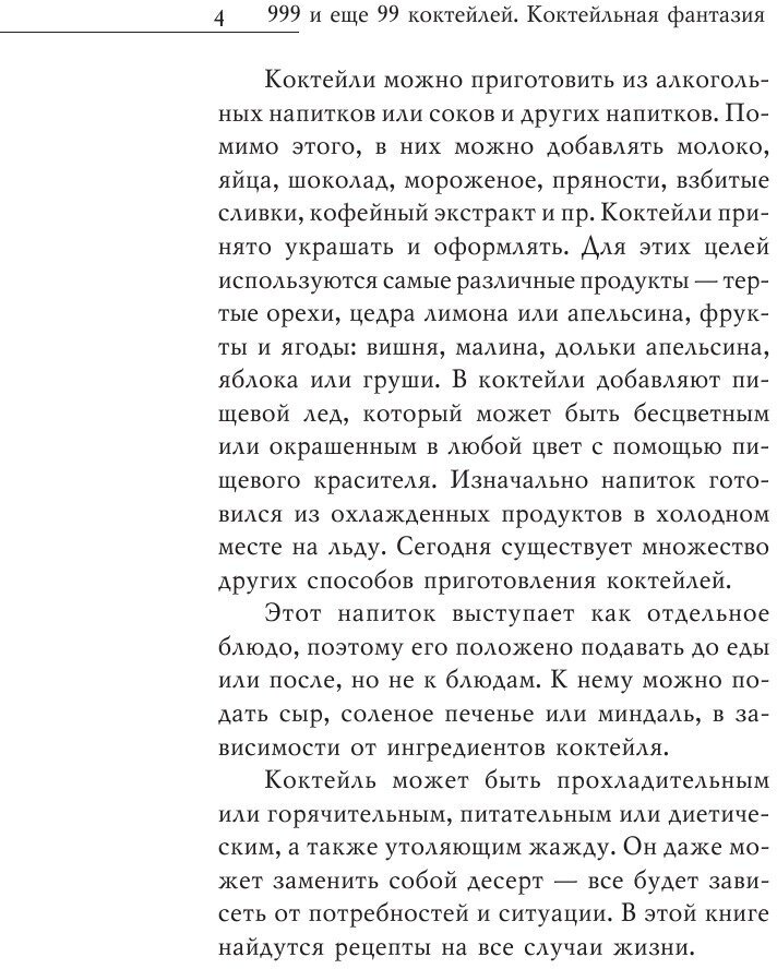 Коктейли бывают алкогольные и безалкогольные. В зависимости от действия на организм они могут быть утоляющими жажду, питательными, освежающими и тонизирующими. Существует огромное количество рецептов коктейлей и способов их приготовления. Постоянно появляются новые рецепты, что связано с открытием баров и ресторанов, которые стремятся привлечь посетителей чем-то оригинальным. С помощью этой книги читатель научится самостоятельно делать самые разнообразные коктейли, а может быть, даже изобретет собственный рецепт.