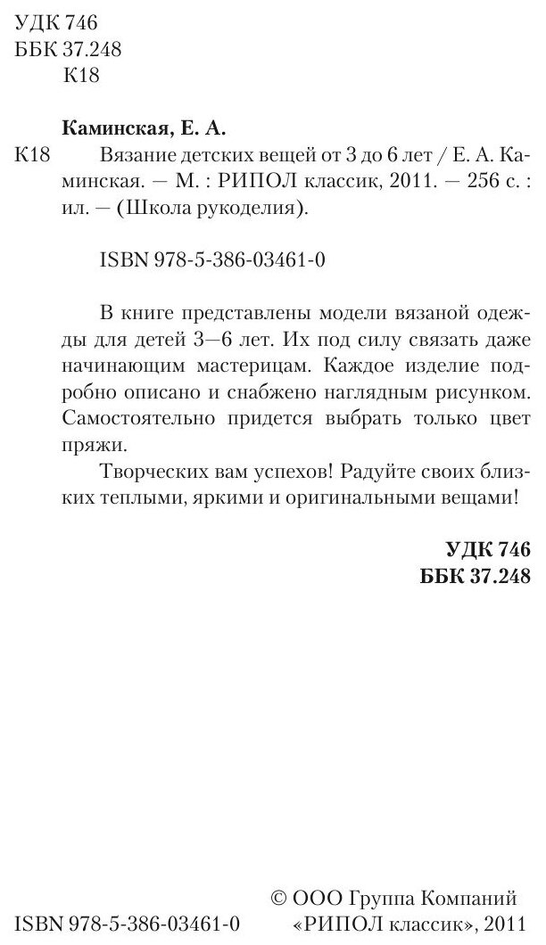 Вязание детских вещей от 3 до 6 лет (Каминская Елена Анатольевна); Рипол-Классик, 2011
