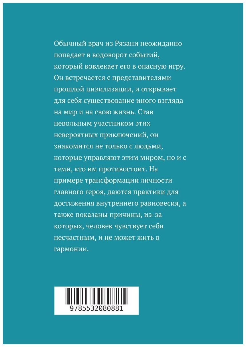 Обычный врач из Рязани неожиданно попадает в водоворот событий, который вовлекает его в опасную игру. Он встречается с представителями прошлой цивилизации, и открывает для себя существование иного взгляда на мир и на свою жизнь. Став невольным участником этих невероятных приключений, он знакомится не только с людьми, которые управляют этим миром, но и с теми, кто им противостоит. На примере трансформации личности главного героя, даются практики для достижения внутреннего равновесия, а также показаны причины, из-за которых, человек чувствует себя несчастным, и не может жить в гармонии.