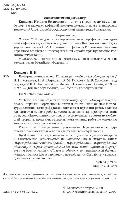 Информационное право. Практикум. Учебное пособие для вузов (Ковалева Наталия Николаевна; Жирнова Наталья Александровна; Тугушева Юлия Михайловна; Холодная Елена Викторовна); Юрайт, 2020