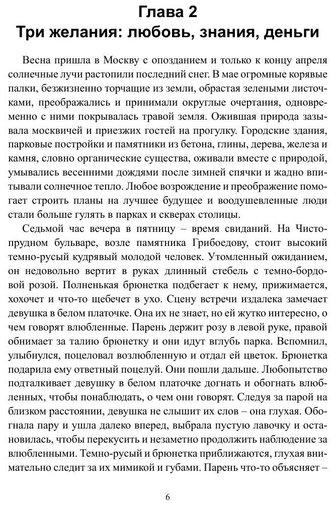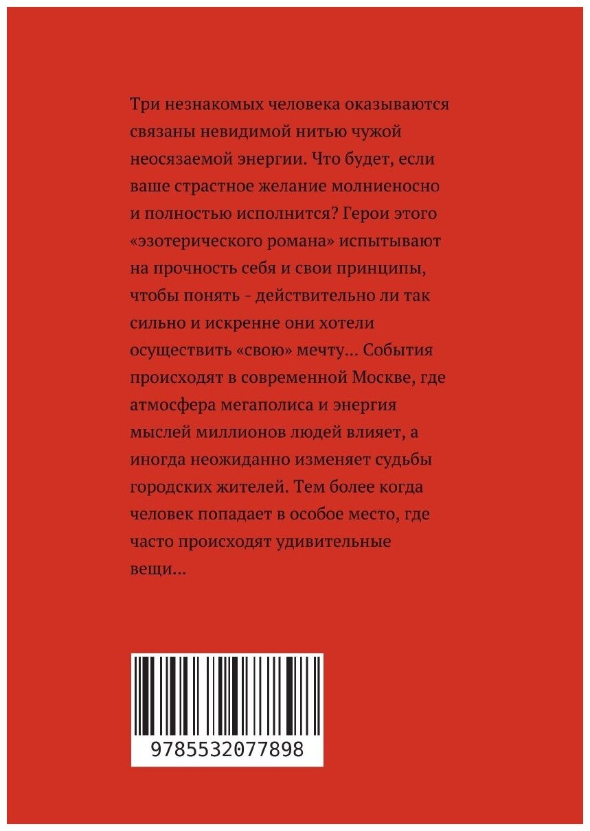 Три незнакомых человека оказываются связаны невидимой нитью чужой неосязаемой энергии. Что будет, если ваше страстное желание молниеносно и полностью исполнится? Герои этого «эзотерического романа» испытывают на прочность себя и свои принципы, чтобы понять – действительно ли так сильно и искренне они хотели осуществить «свою» мечту… События происходят в современной Москве, где атмосфера мегаполиса и энергия мыслей миллионов людей влияет, а иногда неожиданно изменяет судьбы городских жителей. Тем более когда человек попадает в особое место, где часто происходят удивительные вещи…