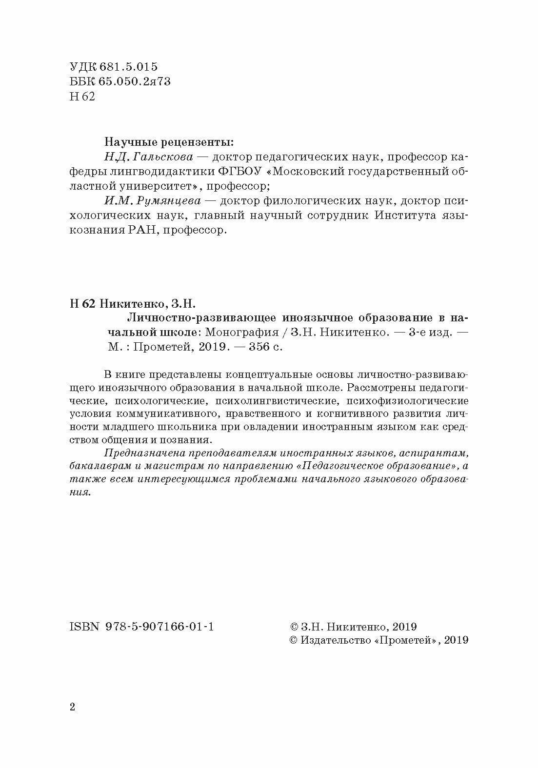 В книге представлены концептуальные основы личностно-развивающего иноязычного образования в начальной школе. Рассмотрены педагогические, психологические, психолингвистические, психофизиологические условия коммуникативного, нравственного и когнитивного развития личности младшего школьника при овладении иностранным языком как средством общения и познания.Предназначена преподавателям иностранных языков, аспирантам, бакалаврам и магистрам по направлению "Педагогическое образование", а также всем интересующимся проблемами начального языкового образования.3-е издание.