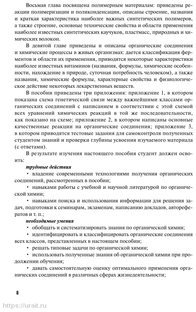 В учебном пособии изложены теоретические основы органической химии. Рассмотрено строение, физические и химические свойства, способы получения и области применения предельных, непредельных, диеновых и ароматических углеводородов, всех кислородсодержащих органических соединений, аминов, анилина, аминокислот, амидов карбоновых кислот и нитросоединений. Дается краткая характеристика белков, пептидов и гетероциклических соединений. Описаны нуклеиновые кислоты, их состав и виды, гидролиз и структура. Рассмотрены виды полимерных материалов, их строение, основные технические свойства и области применения. Приведены и описаны органические соединения и химические процессы в живых организмах. Особенностью пособия является наглядное представление большей части материала в виде схем, таблиц, формул, что способствует лучшему усвоению курса.