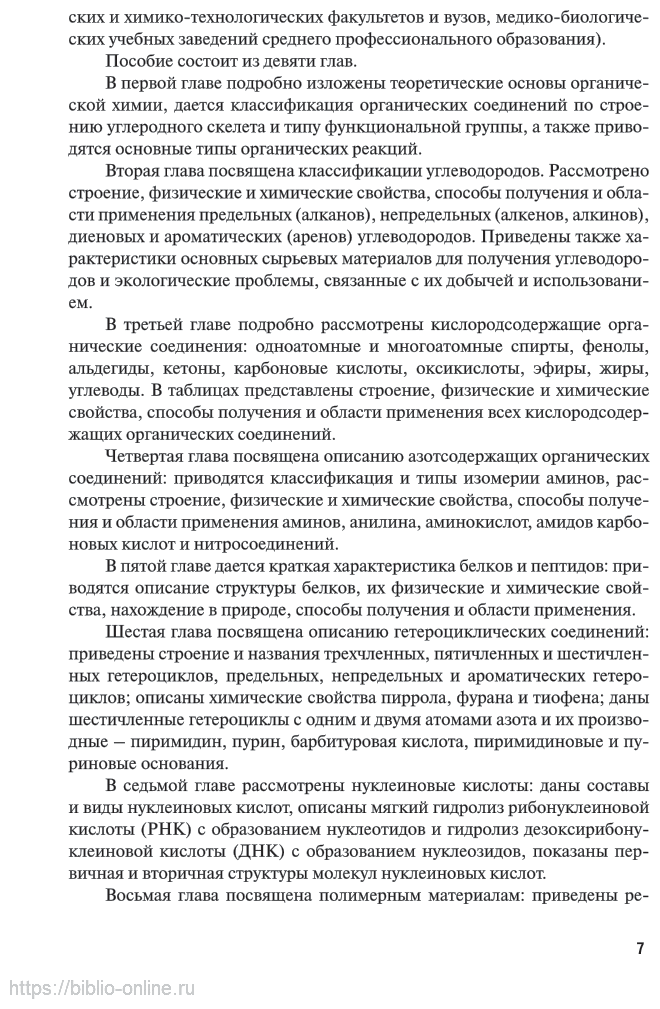 В учебном пособии изложены теоретические основы органической химии. Рассмотрено строение, физические и химические свойства, способы получения и области применения предельных, непредельных, диеновых и ароматических углеводородов, всех кислородсодержащих органических соединений, аминов, анилина, аминокислот, амидов карбоновых кислот и нитросоединений. Дается краткая характеристика белков, пептидов и гетероциклических соединений. Описаны нуклеиновые кислоты, их состав и виды, гидролиз и структура. Рассмотрены виды полимерных материалов, их строение, основные технические свойства и области применения. Приведены и описаны органические соединения и химические процессы в живых организмах. Особенностью пособия является наглядное представление большей части материала в виде схем, таблиц, формул, что способствует лучшему усвоению курса.