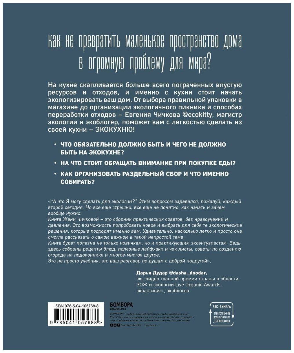 Экологичный образ жизни тесно связан с вашей кухней. Именно на кухне скапливается больше всего потраченных впустую ресурсов и отходов, именно кухня - место организации раздельного сбора мусора и именно с кухни стоит начать "экологизировать" ваш дом. Эта книга - ваш простой путеводитель к экологичному образу жизни. Здесь вы найдете только проверенные советы и лайфхаки: от выбора правильной упаковки в магазине до организации экологичного пикника и способах переработки отходов, которые легко станут частью вашей повседневной жизни и помогут вам как экономить деньги так и сохранять ресурсы на планете.