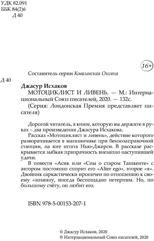 Сервис сравнения цен СкидкаГИД предлагает сравнить цены на товар «Книга: Мотоциклист и ливень (Джасур Исхаков); "Издательство "Интернационального союза писателей", 2020»