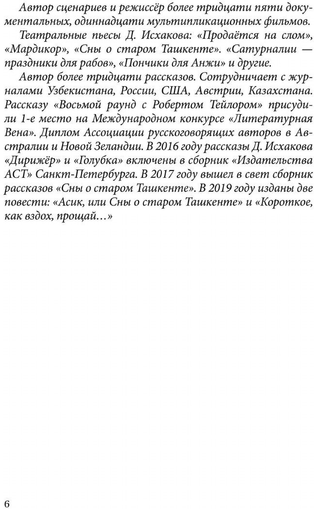 Дорогой читатель, в книге, которую вы держите в руках – два произведения Джасура Исхакова. Рассказ «Мотоциклист и ливень», действие которого разворачивается в магазинчике при бензозаправочной станции, на юге штата Нью-Джерси. В рассказе раскрывается зыбкая призрачность внезапно наступившей удачи. В повести «Асик или «Сны о старом Ташкенте» с автором постоянно спорит его «Alter ego», второе «я». Двойник саркастически ироничен по отношению к своему «хозяину, иногда беспощадно нетерпим. Но, по большому счёту, он любит его.