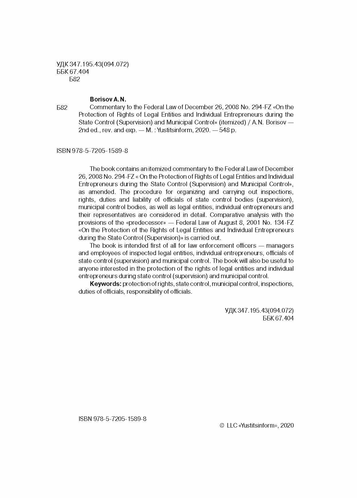 Комментарий к Федеральному закону от 26 декабря 2008 г. № 294-ФЗ «О защите прав юридических лиц и индивидуальных предпринимателей при осуществлении государственного контроля (надзора) и муниципального (Борисов Александр Николаевич, Борисов Алексей Николаевич); Юстицинформ, 2020