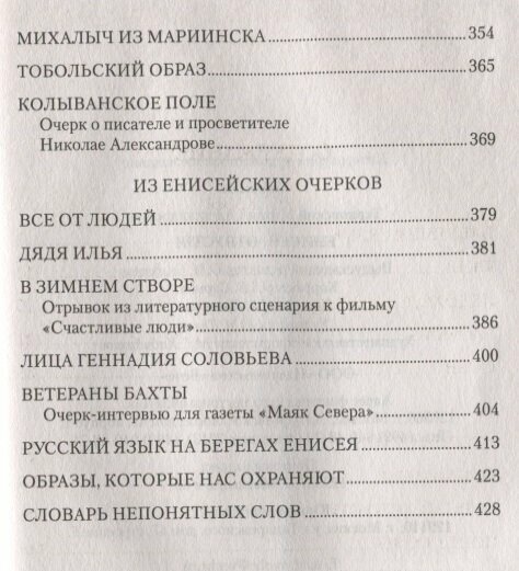 Уникальность этой книги писателя с Енисея в том, что на ее страницах собраны рассказы, повести и очерки, написанные как в конце прошлого столетия, так и совершенно новые, такие как школьная повесть «Полет совы» или очерки о подвижниках малых городов. Четверть века ведет писатель летопись сибирской жизни, длит свою Сибириаду от промхозных советских времен до наших дней, ставших воистину испытанием для тех, кому дороги вековечный уклад, столбовые дороги Отечества. Писатель сам будто учится у нового времени, которое окончательно расставило все на свои места, заветом прокатившись от Балтики до Японского моря и указав единственное спасение: в способности быть русским – любить Родину, любить этих людей со всеми их несовершенствами, любить тайгу, матушку-кормилицу, любить реку – средоточье таинственных и одушевленных сил. Именно поэтому главные учителя писателя – Батюшко-Анисей, простые и удивительные люди, живущие на его берегах, таких молчаливо-суровых на первый погляд, и с такой щедростью открывающих красоту терпеливому и зоркому оку.