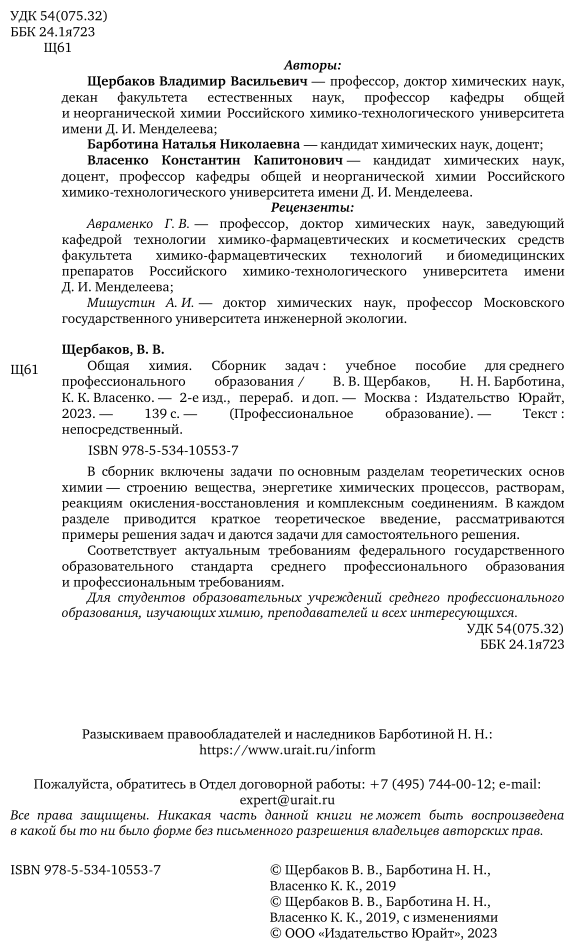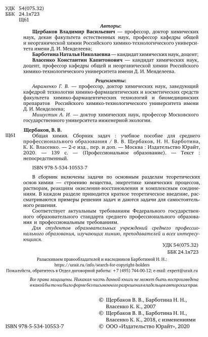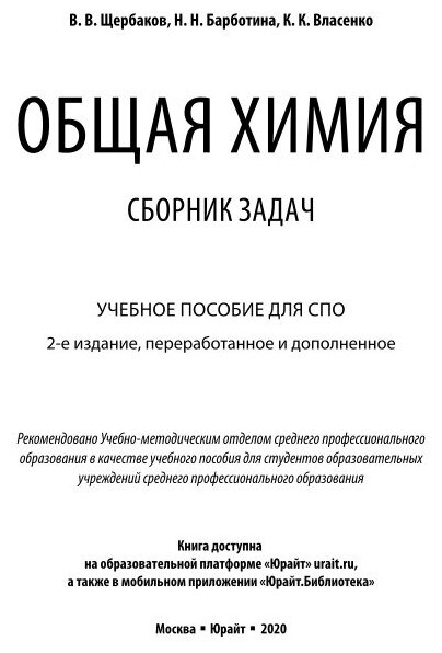 Общая химия. Сборник задач 2-е изд. пер. и доп. Учебное пособие для СПО (Щербаков Владимир Васильевич; Барботина Наталья Николаевна; Власенко Константин Капитонович); ЮРАЙТ, 2019
