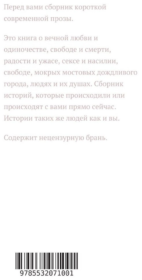 Перед вами сборник короткой современной прозы. Это книга о вечной любви и одиночестве, свободе и смерти, радости и ужасе, сексе и насилии, свободе, мокрых мостовых дождливого города, людях и их душах. Сборник историй, которые происходили или происходят с вами прямо сейчас. Истории таких же людей как и вы. Содержит нецензурную брань.