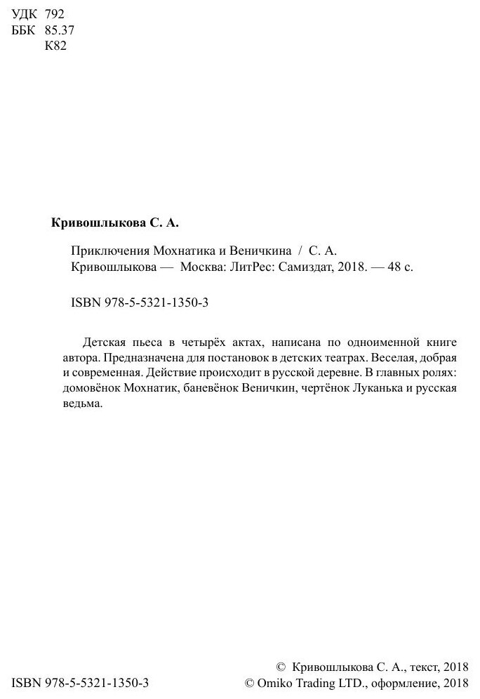 Пьеса Светланы Кривошлыковой «Приключения Мохнатика и Веничкина» по одноименной книге очень красочно и красиво оформлена, и не уступает книге по качеству. В главных ролях давно известные читателю герои. Пьеса состоит из четырех актов, расписаны характеры и костюмы. Хочется сказать большое спасибо автору за профессионализм и новую идею – воплотить книгу в пьесу! Такие интересные пьесы, как нельзя, кстати, нужны для проведения театрализованных представлений для детей, тем более, что 2019 год – год театра!