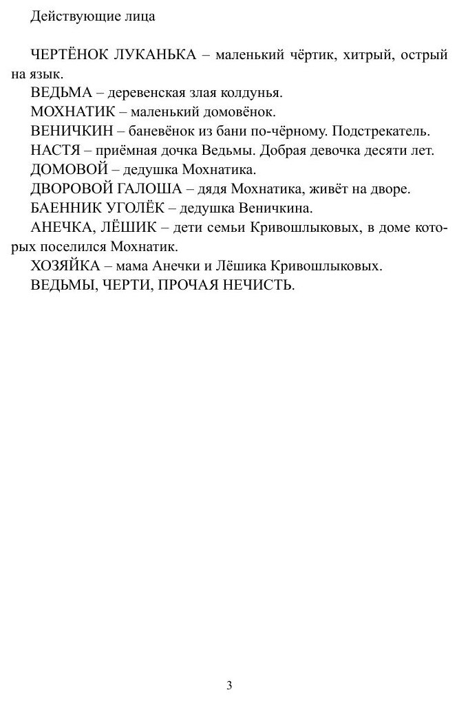 Детская пьеса в четырёх актах, написана по одноименной книге автора. Предназначена для постановок в детских театрах. Веселая, добрая и современная. Действие происходит в русской деревне. В главных ролях: домовёнок Мохнатик, баневёнок Веничкин, чертёнок Луканька и русская ведьма.