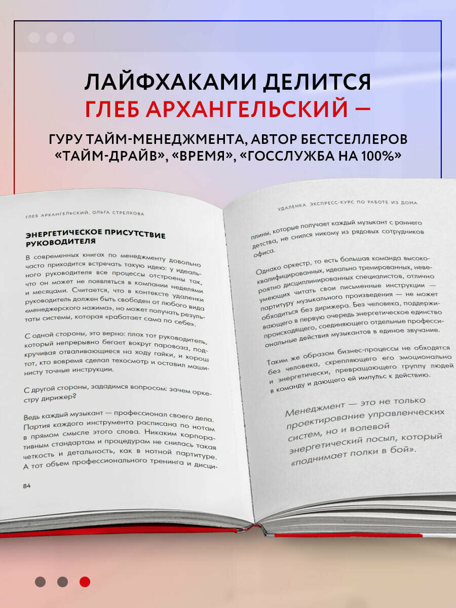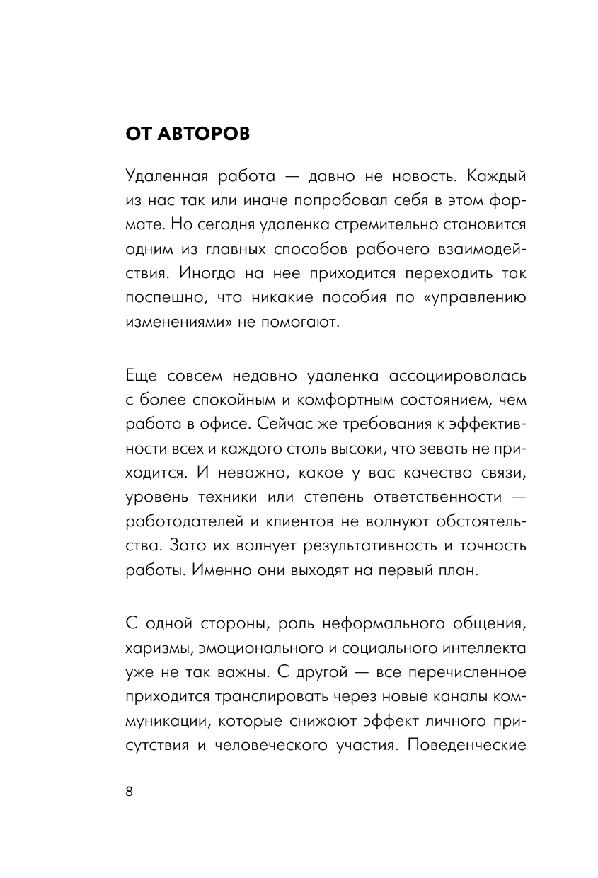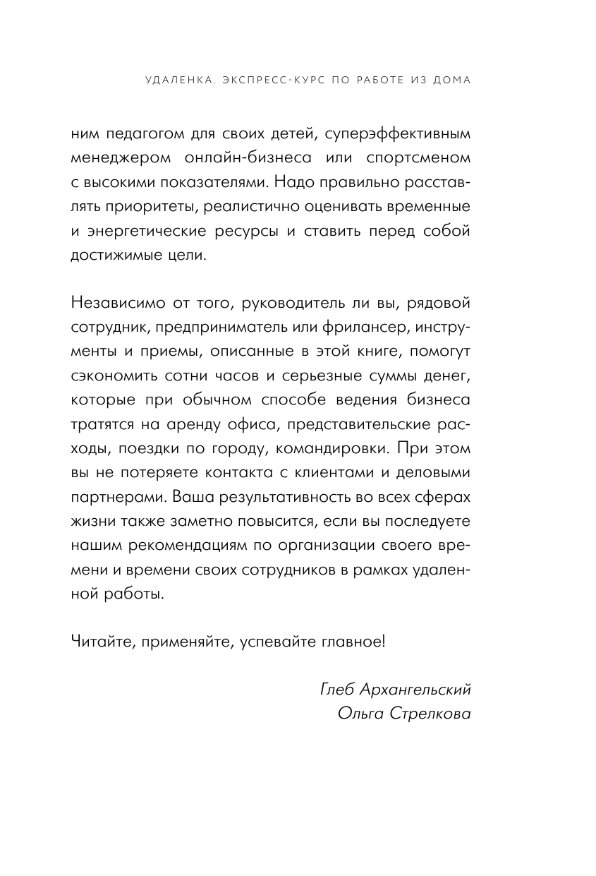 Книга Глеба Архангельского и Ольги Стрелковой - первое реальное руководство по работе из дома. Написанная признанными экспертами по тайм-менеджменту, она задает понятные правила дистанционной работы и помогает общаться онлайн без потери теплого личного контакта. Быстро переходить из состояния "тискаю котика" в состояние "решаю важные задачи". Мастерски использовать современные инструменты онлайн-работы.