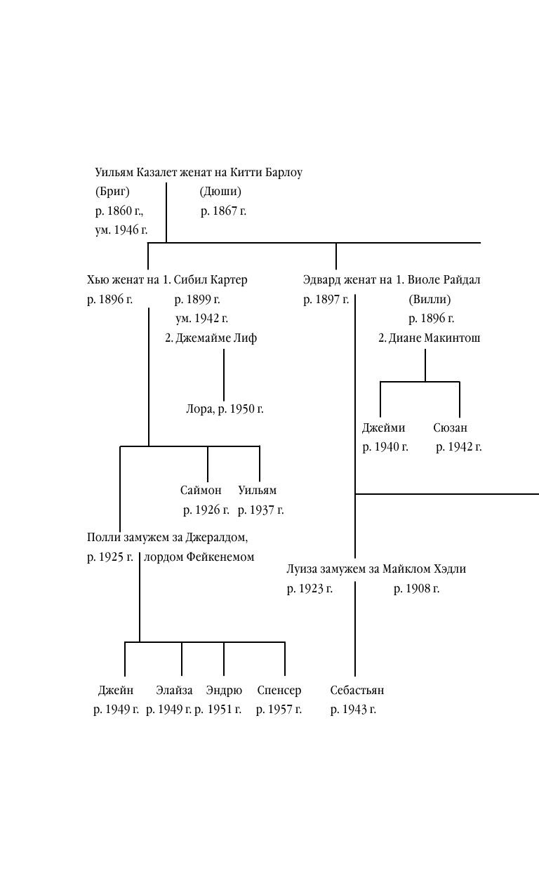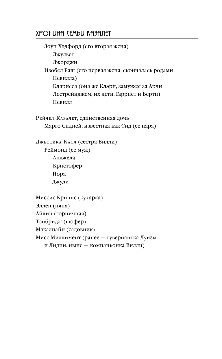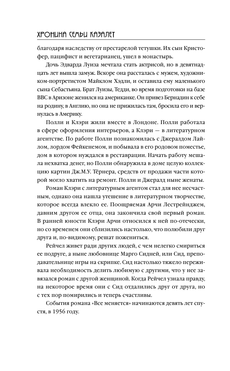 1950. Матриарх семьи Казалетов, всеми любимая Дюши, уходит из жизни, закрывая за собой дверь в мир усадеб и слуг, классовых различий и нерушимых традиций, в котором Казалеты процветали. Луиза, теперь разведенная, влюбляется, но ее роман оказывается не таким уж безоблачным. Полли и Клэри тем временем пытаются найти баланс между семьей и собственными амбициями. Хью и Эдвард, которым перевалило за шестьдесят, ощущают себя потерянными в новом мире. Вилли, которую уже давно оставил муж, должна наконец научиться быть самостоятельной. Но главные испытания ждут Рейчел, которая всегда жила для других… Кульминация ждет все семейство в Хоум-плейс, где в рождество новое поколение Казалетов смело вступит в свои права. Только одно можно сказать наверняка - жизнь уже никогда не будет прежней.