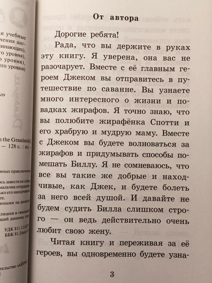 Книга повествует об опасных и одновременно забавных приключениях в Африканской саванне.Однажды сестре двенадцатилетнего Джека вздумалось завести не собаку, не кошку, а... жирафа. Вместе с ее незадачливым мужем мальчик отправляется в саванну на поиски симпатичного жирафенка. И только его находчивость и смекалка не позволяют осуществиться жестокой мечте.Каждая глава снабжена упражнениями, направленными на развитие навыков речи и отработку грамматики.Пособие адресовано учащимся 3-4 классов школ, лицеев и гимназий. Книга содержит англо-русский словарь, соответствующий данному этапу обучения.