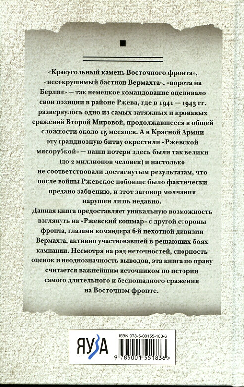 Данная книга предоставляет уникальную возможность взглянуть на "Ржевский кошмар" с другой стороны фронта, глазами командира 6-й пехотной дивизии Вермахта, активно участвовавшей в решающих боях кампании. Несмотря на ряд неточностей, спорность оценок и неоднозначность выводов, эта книга по праву считается важнейшим источником по истории самого длительного и беспощадного сражения на Восточном фронте.