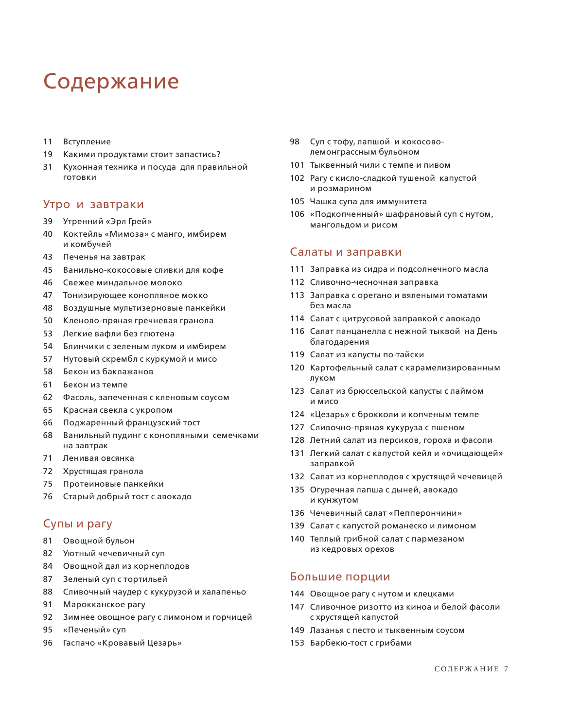 Вас ждут 7 разделов с уникальным подборками блюд на завтрак, обед и ужин. Также автор разработала специальную систему условных обозначений, благодаря которым ваше погружение в мир растительной пищи пройдет легко и очень скоро вы станете экспертом в области веганской кухни.
