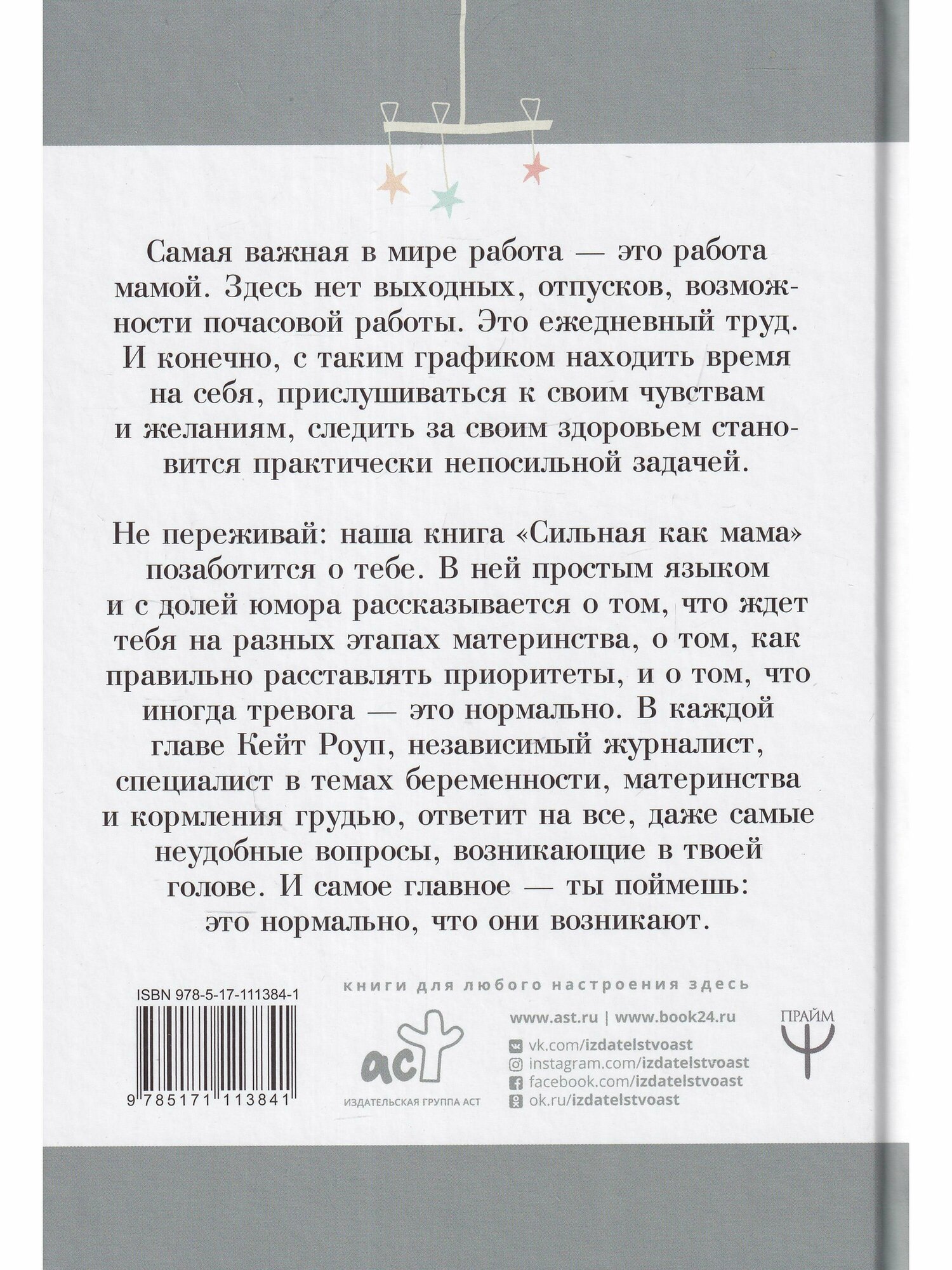 Не переживай: наша книга «Сильная как мама» позаботится о тебе. В ней простым языком и с долей юмора рассказывается о том, что ждет тебя на разных этапах материнства, о том, как правильно расставлять приоритеты, и о том, что иногда тревога – это нормально. В каждой главе Кейт Роуп, независимый журналист, специалист в темах беременности, материнства и кормления грудью, ответит на все, даже самые неудобные вопросы, возникающие в твоей голове. И самое главное – ты поймешь: это нормально, что они возникают.