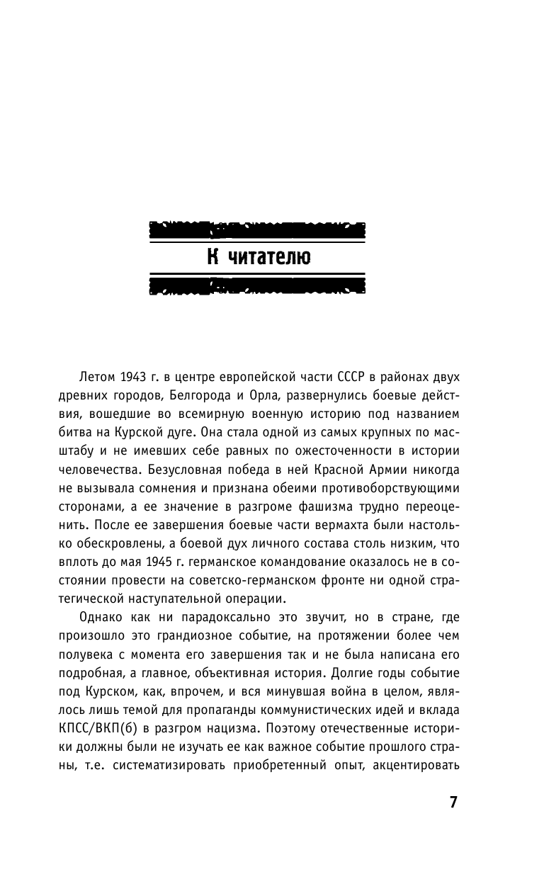 Валерий Замулин, пожалуй, крупнейший эксперт мира по Курской битве. Автор сам живет в Прохоровке (в 43-м ст. Прохоровка), много лет работал в музее этой битвы, руководил им (об этом не пишется в книге, книга строго по теме). Чем отличается книга Замулина от других книг по Курской битве (например, соответствующего раздела "Освобождения" Исаева)? Масштабом и подробностью. Только здесь изложение порой (когда это важно) доходит до описания действий стрелкового (или пехотного) батальона (а иногда и роты), только здесь события одного дня битвы на фронте 20 км занимают многие десятки страниц. Для понимания, в книге описывается далеко не вся Курская битва, даже не вся битва на южном фасе Курского выступа. Описано только этап наступательных действий 4-й танковой армии немцев до подхода их к станции Прохоровка (только 5 дней и только противостояние 4-й танковой армии и наших 1-й танковой и 6-й гвардейской). Здесь так же нет описания действий армейской группы Кемпфа. Я это к тому, что книга очень подробная и ее дополняют другие книги Замулина ("Прохоровка", "Забытое сражение огненной дуги" и т.д.). Очень рекомендую. Книга читается с большим удовольствием.