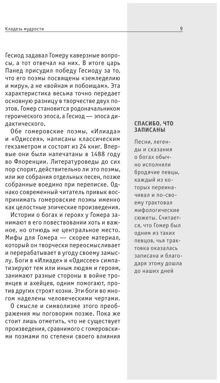 Книга призвана зародить интерес к мифам древней Греции. На какую либо научную ценность она не претендует. Скорее это даже не знакомство, а соприкосновение с темой. Для тех же, кто проникся и хочет большего, указанны пара-тройка источников в тексте и список литературы в конце, с которого и стоит начать знакомство с темой. Верста книги не вполне удобна для электронных читалок – боковые вставки и основной текст заставляют то и дело возвращаться на предыдущую страницу. В целом, стоит не дорого, читается легко. К покупке рекомендую, как знак признательности для авторов, да и просто для коллекции. Всех благ.
