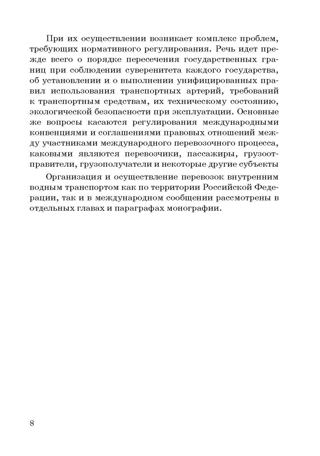 В монографии освещены основные положения, характеризующие организационно-правовую систему внутреннего водного транспорта. Дан анализ судоходства на внутренних водных путях, его безопасности, использования поверхностных объектов, буксировки судов, плотов и иных плавучих объектов, лоцманской проводки судов. Рассмотрены вопросы осуществления государственного управления в области внутреннего водного транспорта, государственного надзора в указанной сфере, портового контроля.