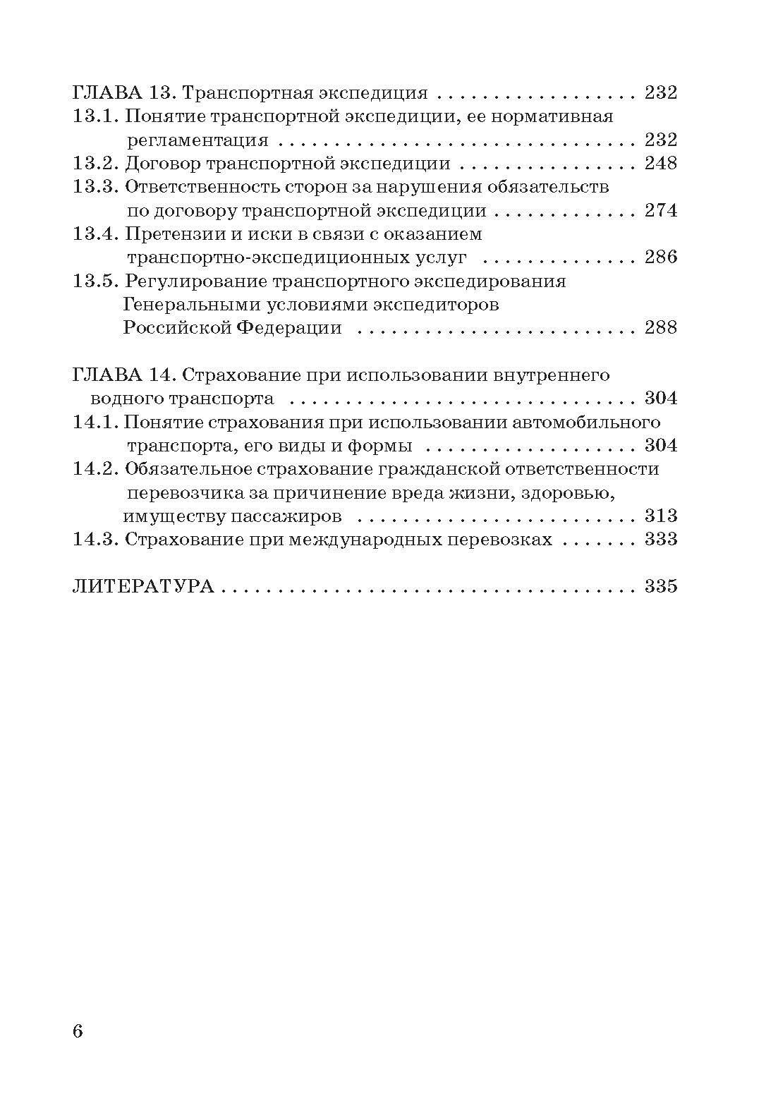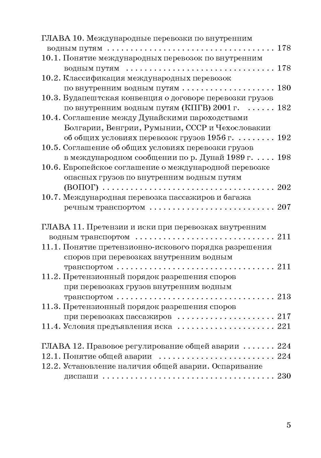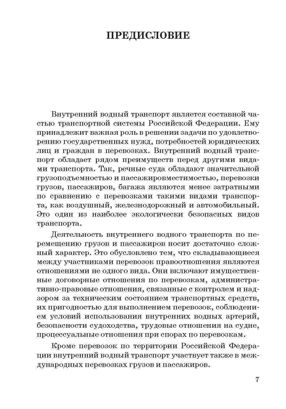 Дан анализ ответственности сторон внутренних водных договорных обязательств при их нарушении, претензионного и искового порядка разрешения споров. Рассмотрены такие специфические институты внутреннего водного транспортного права, как общая авария и возмещение убытков от столкновения судов. Раскрыты вопросы транспортно-экспедиционного обслуживания при перевозках внутренним водным транспортом и страхования.
