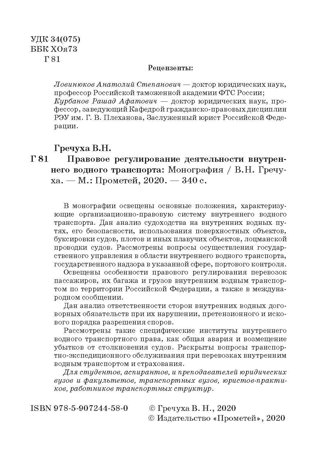 Правовое регулирование деятельности внутреннего водного транспорта (Владимир Николаевич Гречуха); Прометей, 2020