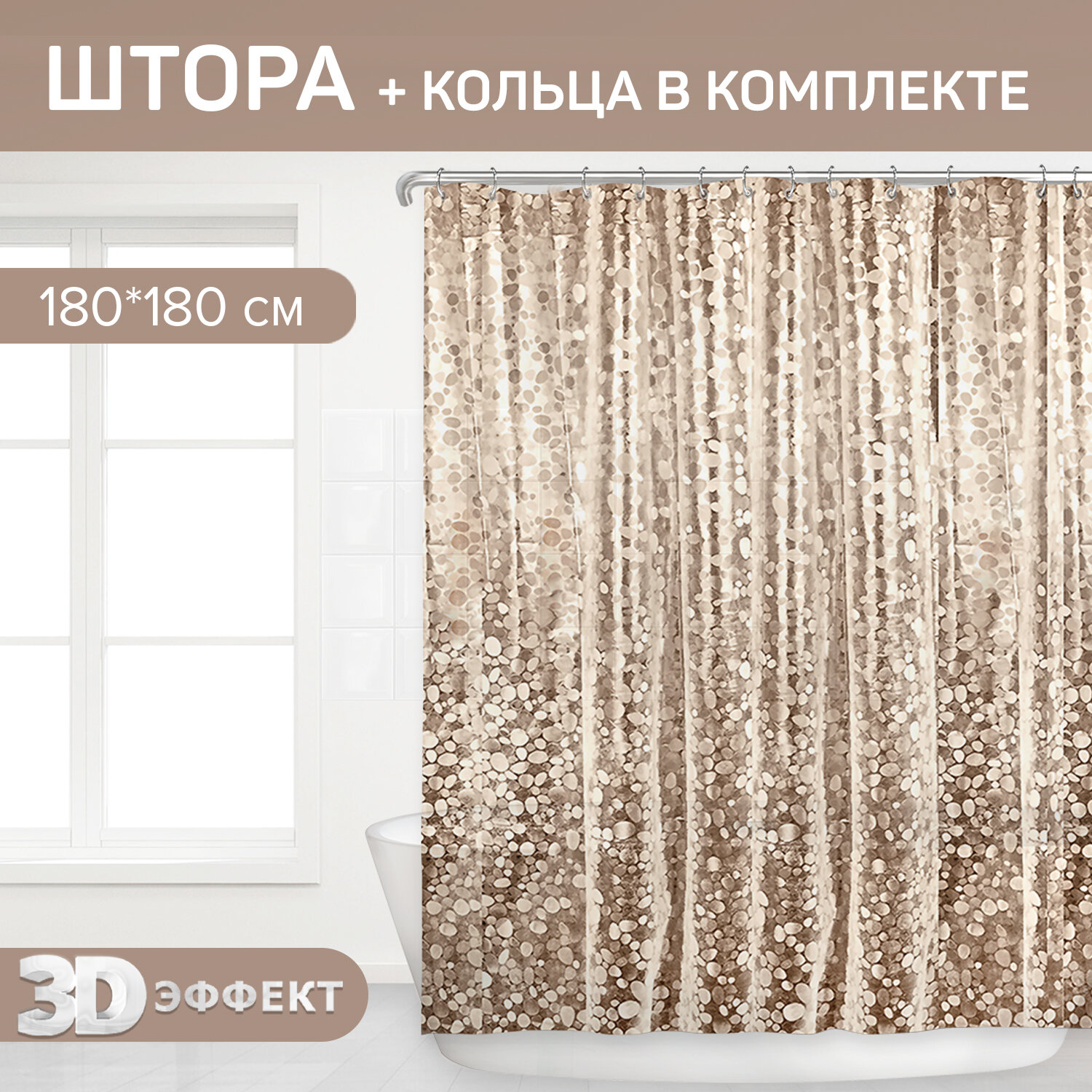 Благородный блеск россыпи золотистых камней на шторе для ванной STONES от VALIANT наполнит комнату энергией солнечного света и тепла. Благодаря 3D-эффекту свет преломляется в мелких камешках, штора начинает светиться, искриться и переливаться. - изделие идеально защищает ванную комнату от брызг - легко крепится на прозрачные пластиковые кольца ( 12 колец в комплекте) - легко чистится мягкой губкой с мылом - 100% водоотталкивающие свойства Материал: PEVA Размер изделия 180*180 см.