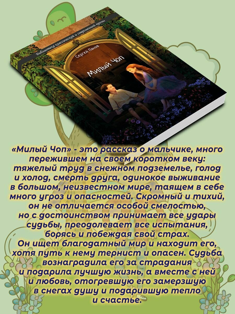 «Милый Чоп» – это рассказ о мальчике, много пережившем на своем коротком веку: тяжелый труд в снежном подземелье, голод и холод, смерть друга, одинокое выживание в большом, неизвестном мире, таящем в себе много угроз и опасностей. Скромный и тихий, он не отличается особой смелостью, но с достоинством принимает все удары судьбы, преодолевает все испытания, борясь и побеждая свой страх.
